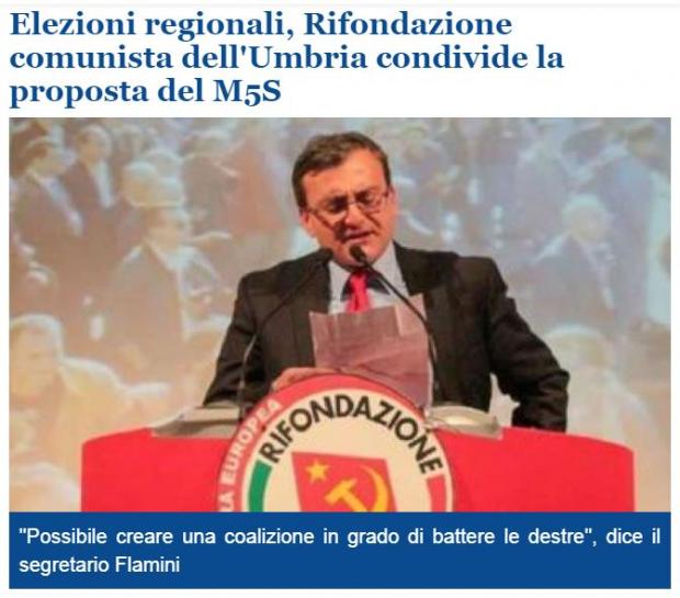Incredibile ma vero. «Rifondazione comunista dell'Umbria rispetto alle elezioni regionali condivide pienamente la proposta avanzata dal Movimento 5 Stelle. Abbiamo lavorato da tempo proprio nella direzione oggi individuata da Di Maio all'interno del metodo e dei contenuti de L'Altra Umbria e della coalizione civica, verde e sociale. Siamo disposti a ragionare su come costruire una nuova coalizione politica e di cittadinanza capace di essere includente, ma anche fortemente rinnovata...
