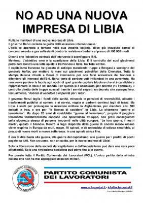 Solo la liberazione della società dal capitalismo e dall'imperialismo può dare una vera pace all'umanità. Solo una rivoluzione socialista può porre fine alle guerre. Rullano i tamburi di una nuova impresa di Libia. Il governo Renzi reclama la guida della missione internazionale. L'Italia si appresta a tornare nella sua vecchia colonia, dove già inaugurò campi di concentramento e gas asfissianti contro la resistenza berbera al prezzo di 100.000...