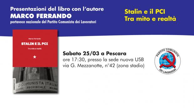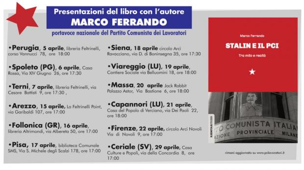 Le presentazioni del libro Stalin e il PCI. Tra mito e realtà (Marco Ferrando, Red Star Press editore) continuano in tutta Italia. Gli appuntamenti del mese di aprile sono in Umbria, Toscana e Liguria: a Perugia, Spoleto (Perugia), Terni, Arezzo, Follonica (Grosseto), Pisa, Siena, Viareggio (Lucca), Massa, Capannori (Lucca), Firenze e Ceriale (Savona). Parteciperà l'autore, Marco Ferrando, portavoce nazionale del PCL. Le informazioni sulle presentazioni sono nella pagina...