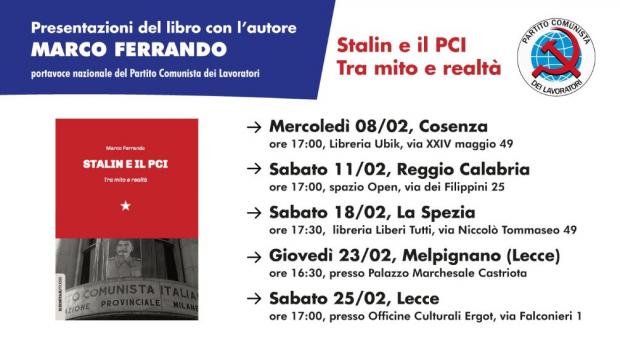 Proseguono le presentazioni del libro Stalin e il PCI. Tra mito e realtà, di Marco Ferrando, Red Star Press editore. I primi appuntamenti in Veneto sono a Padova il 19 gennaio, a Schio (VI) il 20 gennaio e a Conegliano (TV) il 21 gennaio. Le date successive saranno sul sito prossimamente. Se desideri ricevere una copia del libro o se vuoi organizzare una presentazione nel tuo comune, scrivici una e-mail a info@pclavoratori.it o un messaggio sulla nostra pagina Facebook.