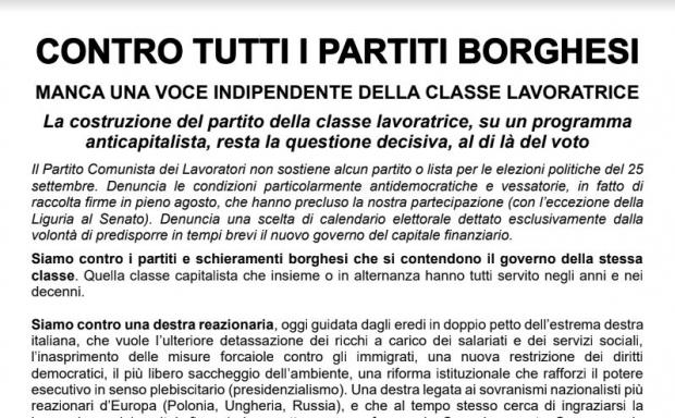 Volantino del PCL sulle elezioni politiche del 25 settembre Il Partito Comunista dei Lavoratori non sostiene alcun partito o lista per le elezioni politiche del 25 settembre. Denuncia le condizioni particolarmente antidemocratiche e vessatorie, in fatto di raccolta firme in pieno agosto, che hanno precluso la nostra partecipazione (con l’eccezione della Liguria al Senato). Denuncia una scelta di calendario elettorale dettata esclusivamente dalla volontà di predisporre in tempi...