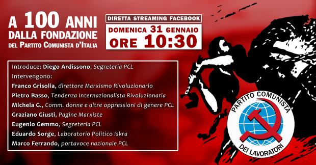 Domenica 31 gennaio, alle ore 10.30, in diretta streaming sulla pagina Facebook del Partito Comunista dei Lavoratori. A cento anni dalla fondazione del Partito Comunista d'Italia, sezione della Terza Internazionale, ripercorriamo insieme le ragioni e gli insegnamenti di quel grandioso fatto storico, tanto importanti ancora oggi per lo sviluppo e l'azione del marxismo rivoluzionario. Interverranno compagne e compagni del PCL, della Tendenza Internazionalista Rivoluzionaria, della...